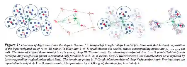该方法依赖于 Caratheodory 定理,其表明一个核心集合(d2 + 1 的点集合,维度为 d)足够表征凸集中所有 n 个点。该论文的新颖之处在于它提出了分治算法(divide-and-conquer),从而通过可接受的复杂度(O(nd + d5 log n),其中 d << n)抽取核心集合(coreset)。