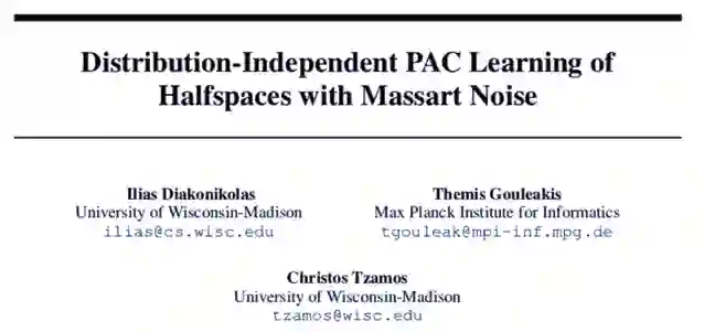 :本文作者研究了分布独立的半空间(half-space)下的 PAC 学习问题(在 Massart 噪声下)。具体而言,给定一组带标签样本(x, y),采样于 R^d+1 维的分布 D,如此以来,未带标签点 x 上的边缘分布是任意的,并且标签 y 通过一个未知半空间生成,而这个未知半空间被 Massart 噪声破坏,其中噪声率η<1/2。现在我们的目的是找出假设 h,它能够最小化误分类误差(misclassification error)