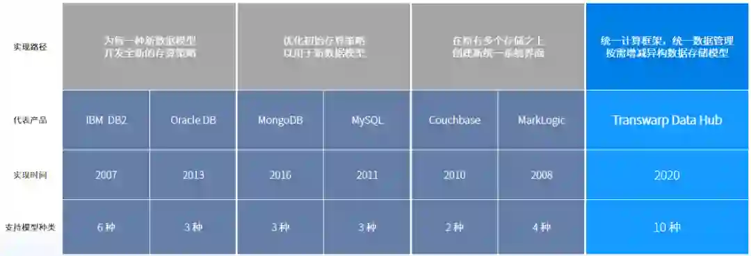 第一种:以 IBM DB2 和 Oracle DB 为代表,分别支持 6 个和 3 个模型种类。这一实现路径为每一种新数据模型开发独立完整的存算策略。其缺点是存算耦合,支持的模型越多,系统的开发量和复杂度就越高,消耗的存算资源也较多。