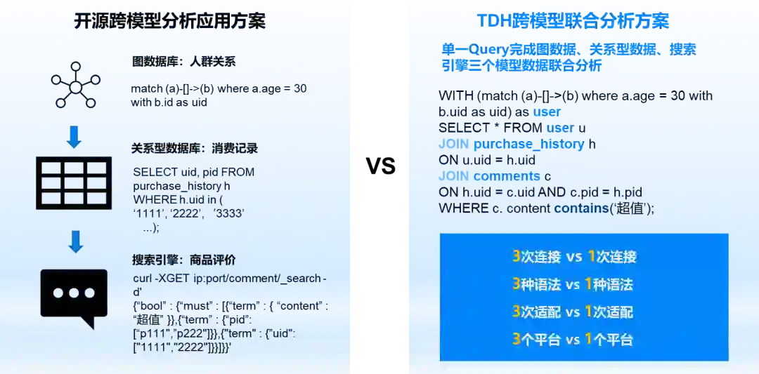 为完成这个业务,用户需要搭建 3 个独立的数据库,并在应用适配 3 种数据库的连接方式和查询语言,同时还要求开发人员同时了解这 3 种数据库的开发技术,整个流程非常复杂,技术要求非常高。此外,3 个独立系统的数据可能存在不一致,比如消费记录更新到了关系型数据库,但相应的评价没有更新到搜索引擎中,导致分析语句的结果不准确。