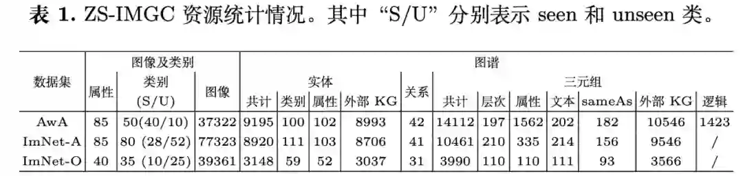 我们以ZS-IMGC任务的三个基准数据集AwA、ImNet-A和ImNet-O为例构建了该资源,资源的统计信息如下表所示。