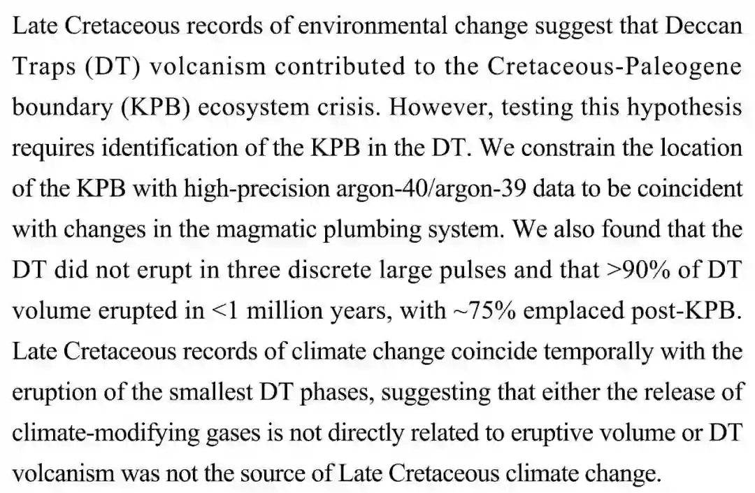 (导读 过泽远)白垩纪晚期环境变化记录暗示德干地盾(DT)火山活动可能导致了白垩纪-古近纪(KPB)生态危机。本文用高精度氩-40/氩-39数据来确定KPB的位置,发现DT并未出现三次大喷发,90%的喷发在不到100万年内完成,75%出现在KPB后。晚白垩世气候变化仅与最小喷发阶段短暂一致,暗示DT火山活动在大灭绝中的作用可能仍不明确。
