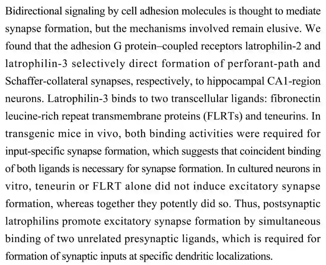 Latrophilin G蛋白偶联受体通过同步结合FLRT和teneurins蛋白指导突触特异性形成