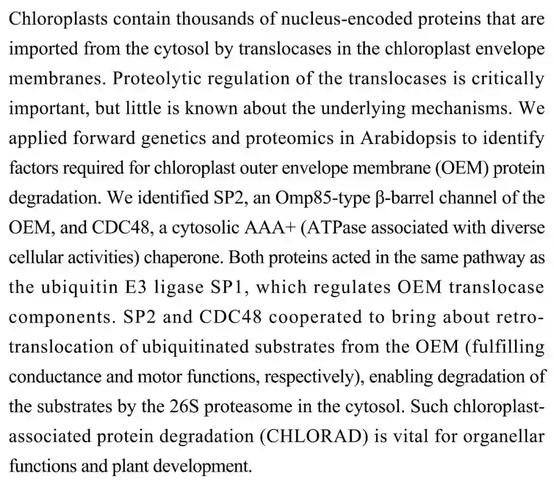 (导读 过泽远)叶绿体相关蛋白降解对细胞器功能和植物发育至关重要。本文通过遗传学和蛋白质组学确立了拟南芥叶绿体外膜(OEM)蛋白降解所需的因子(SP2和CDC48)。这两种蛋白因子的作用途径与泛激素E3连接酶SP1相同,导致泛素化底物的逆转录易位并使其在细胞溶胶中被26S蛋白酶体降解。