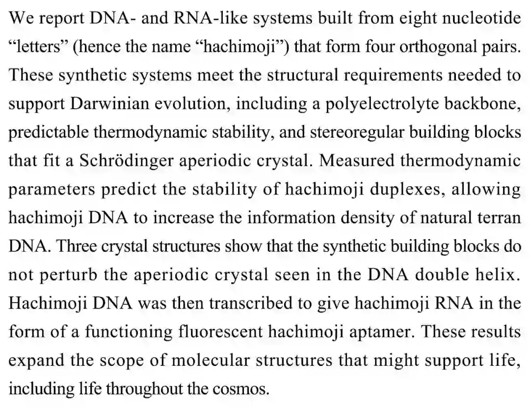 (导读 王思菲)本研究报道了由8个核苷酸“字母” (Hachimoji为日文的“八字母”)组成四个正交配对,类似DNA及RNA的系统。这个系统符合达尔文演化的条件:聚电解质骨架、热力学稳定性及符合薛定谔非周期晶体的立体规律构件。Hachimoji DNA能被转录成带有荧光活性的Hachimoji RNA适配体。综上结果拓展了包括全宇宙在内关于生命基本分子结构的视野。