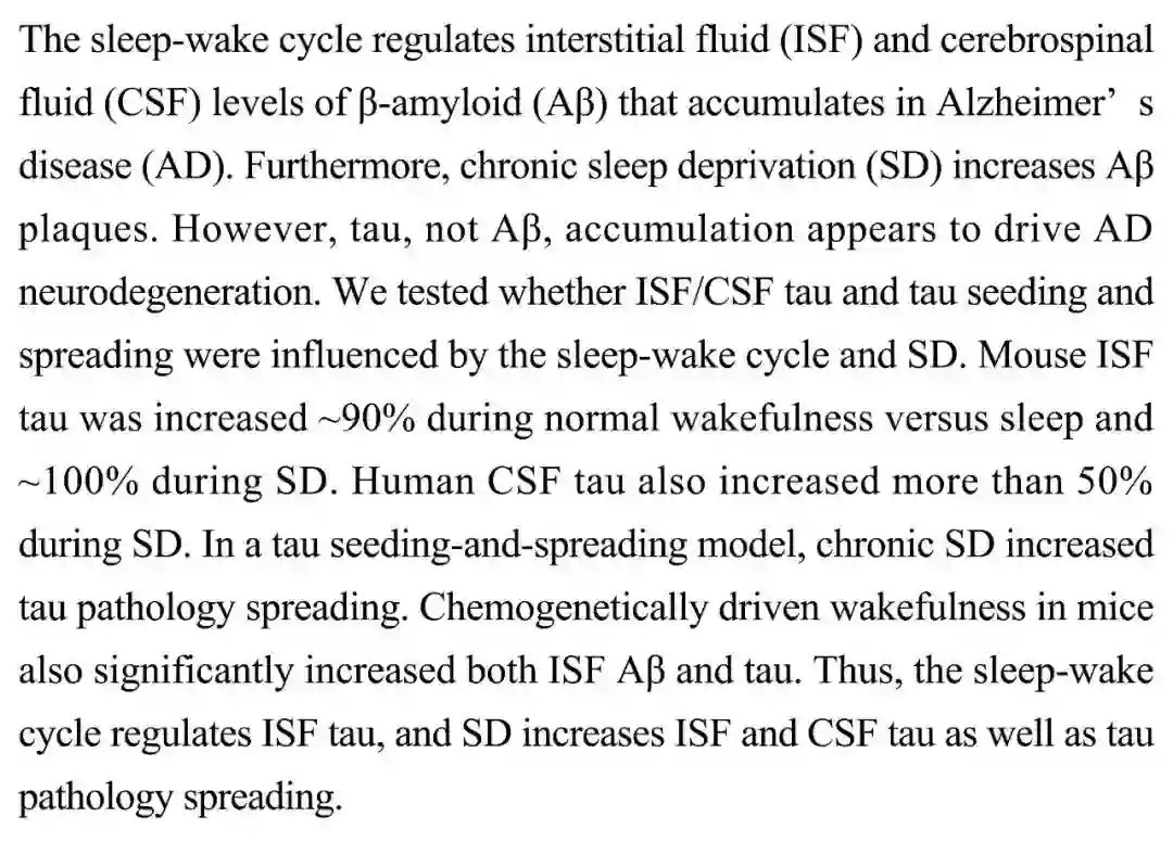 (导读 郭怿暄)睡眠-觉醒周期调控脑间质液(ISF)和脑脊髓液(CSF)中β-淀粉样蛋白(A β)的水平。慢性睡眠剥夺(SD)增加A β斑块。但tau驱动了阿尔兹海默症的神经退化。本研究发现小鼠ISF中tau在正常觉醒时比睡眠增加90%,在SD中增加100%,化学遗传学手段驱动小鼠觉醒导致ISF中A β和tau均显著增加。人类SD同样会使CSF tau增加超过50%。慢性SD可增加tau的病理播散。