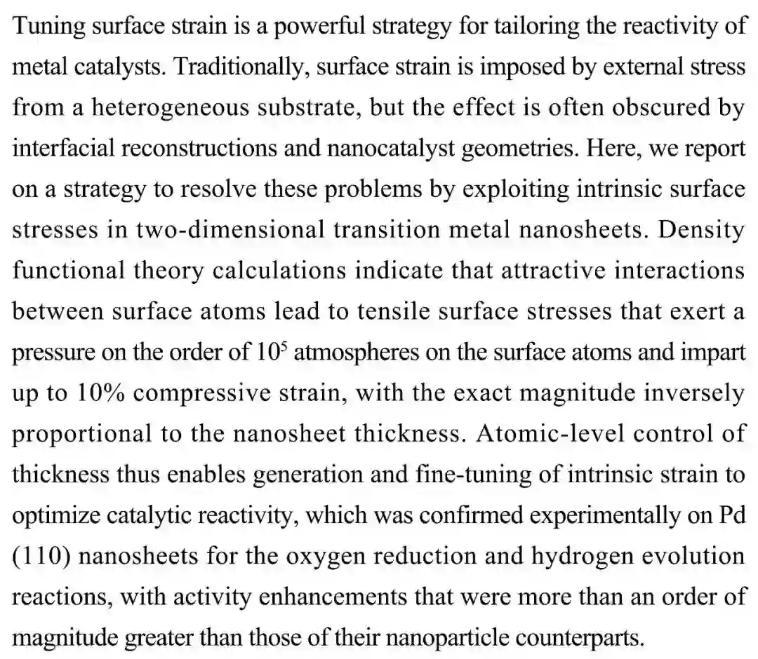 (导读 页一)金属催化剂的活性可通过表面应变去调节,但目前主要受界面重构和几何的限制。本研究通过调节二维过渡金属纳米薄层固有的表面应力来解决这些问题。密度泛函理论的计算表明,表层原子之间的吸引作用导致催化剂内部产生压缩应变,同时结合Pd(110)纳米薄层的氧还原和氢生成反应实验验证了通过调节催化剂应变从而对其活性进行微调的可行性。