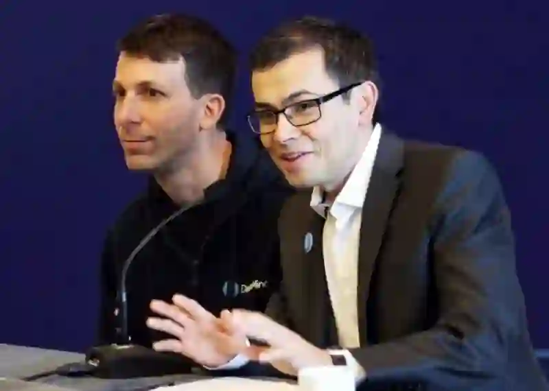 DeepMind AlphaGo项目首席研究员大卫.西尔弗(David Silver,左)与CEO德米斯.哈比斯(Demis Hassabis)