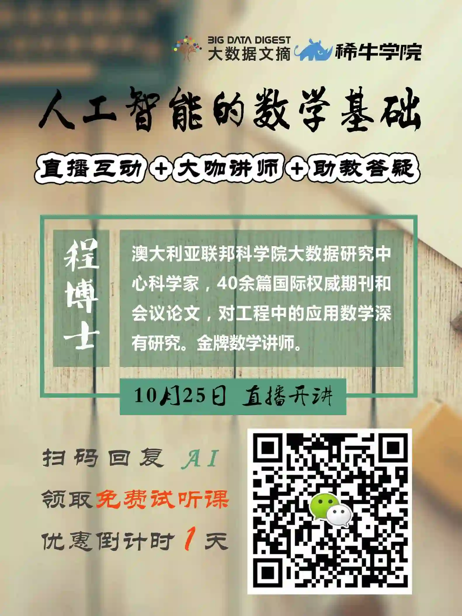程博士曾经在信号处理领域做过深入研究,对于计算机领域涉及到的数学问题,也同样有着非常独到的理解。而正是他这种基于大量工程项目经验的理解,能够很轻易的帮助同学们把非常抽象复杂的数学问题,讲的生动有趣,透彻明白。