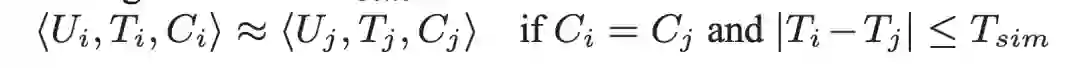 U是指账号,T是指行为发生的时间戳,C就是限制资源(两个账号有相同的行为,使用同一个 IP,或作用对象一致都可以作为限制资源),如果两个账号的行为的时间间隔小于 Tsim ,那么可以认为这两个行为是一致的。