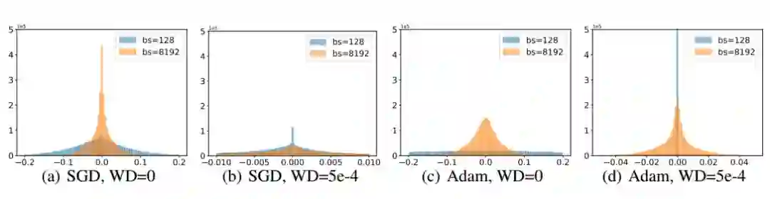 图 3:权重的直方图。权重衰变率为 0、批尺寸较小的时候得到的权重较大。权重衰变率不为 0、批尺寸较大的时候得到的权重较小。