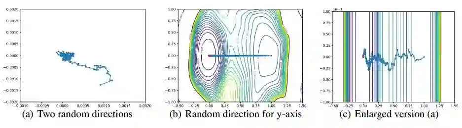 图 8:优化器轨迹的无效可视化。这些可视化方法遭遇了高维空间的随机方向正交性带来的困难。