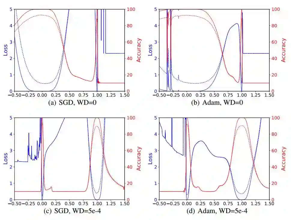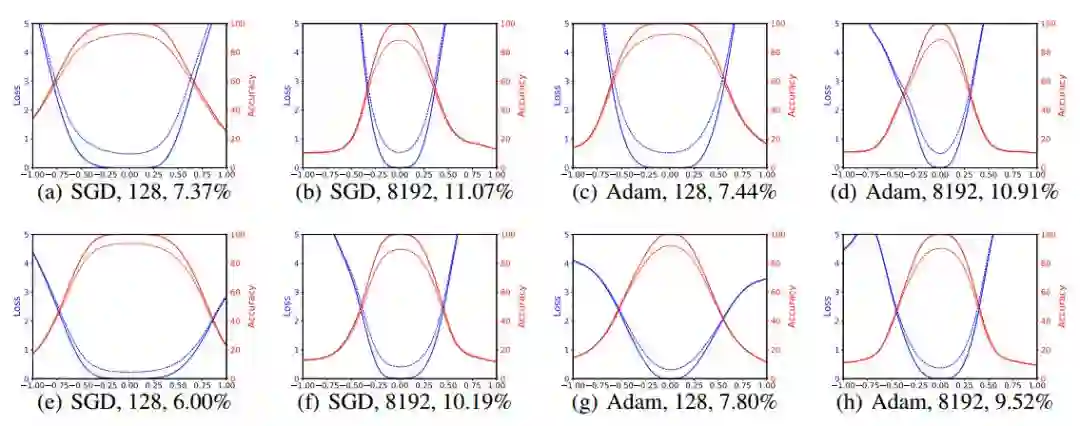 图 2:通过对 VGG-9 使用小批次和大批次方法得到的解的 1D 线性差值。蓝线是损失值,红线是准确率。实线是训练曲线,虚线是测试曲线。小批次在横坐标的 0,大批次在横坐标的 1。