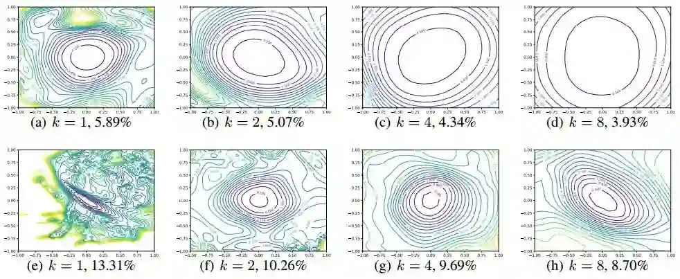 图 7:Wide-ResNet-56(WRN-56)包含捷径连接(上半 4 张)和不包含捷径连接(下半 4 张)在 CIFAR-10 上的损失函数图像。k=2 表示每层有两倍的滤波器,k=4 表示每层有四倍的滤波器,等。测试误差在每个图下方标出。