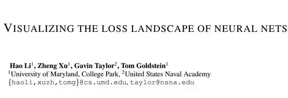 神经网络的训练依赖于寻找高度非凸损失函数的(足够好的)极小值的能力。利用特定的网络架构设计(例如,跳过连接)生成的损失函数可以使训练过程变得更简单,利用精心调整的训练参数(批尺寸、学习率、优化器)可以达到使泛化能力更好的极小值。然而,对于这些规律,以及这些因素对损失函数形态的影响,并没有得到很好的理解。在这篇论文中,我们用多种可视化方法探索了神经网络损失函数结构,以及损失函数的形态对泛化能力的影响。首先,我们介绍了一种简单的「过滤器归一化」(filter normalization)方法帮助我们可视化损失函数的曲率,并对损失函数进行有意义的并排对比。然后我们使用多种可视化方法探索了网络架构对损失函数形态的影响,以及训练参数对极小值的形态的影响。