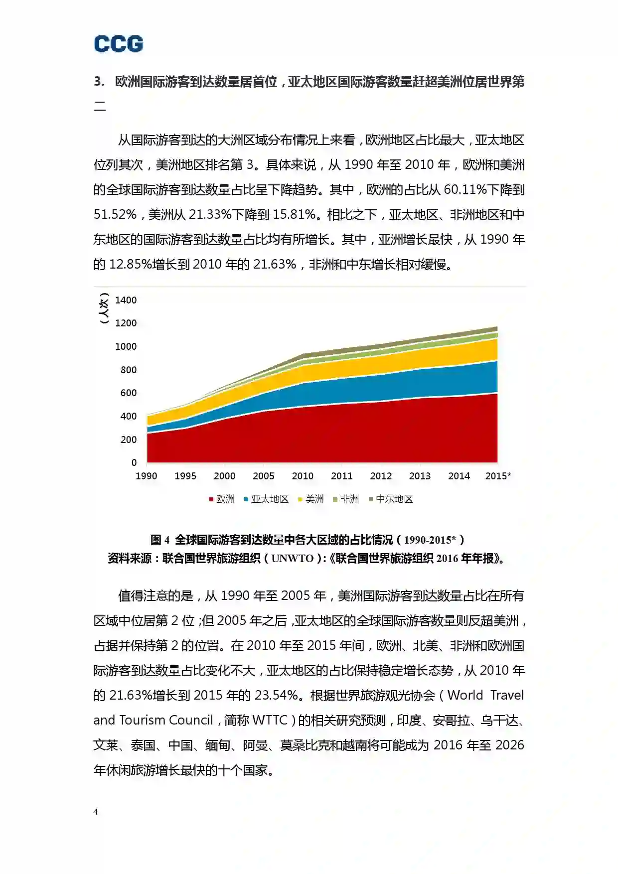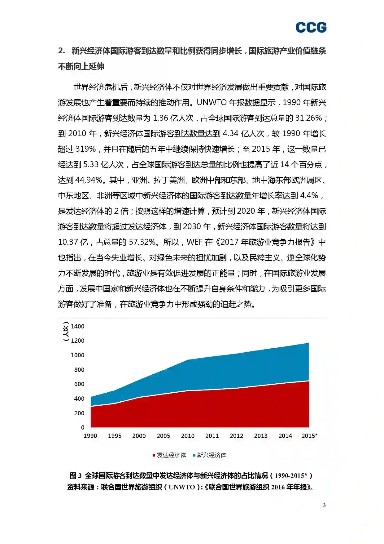新兴经济体国际游客到达数量和比例获得同步增长,全球金融危机过后,新兴经济体不仅对世界经济发展做出重要贡献,对国际旅游市场也产生着重要的推动作用。根据报告,1990年新兴经济体国际游客到达数量仅为1.36亿人次,占全球国际游客到达总量的31.26%,而到2015年,这一数量已达到5.33亿人次,占全球国际游客到达总量的比例提高至44.94%。从国际游客到达的区域分布情况来看,欧洲地区占比最大,亚太地区位列其次,美洲地区排名第三。值得注意的是,从1990年至2005年,美洲地区国际游客到达数量占比在所有区域中位居第二位,但2005年之后,亚太地区反超美洲,并保持第二的位置。亚太地区新兴经济体的快速发展为国际旅游发展注入了了新生能量。
