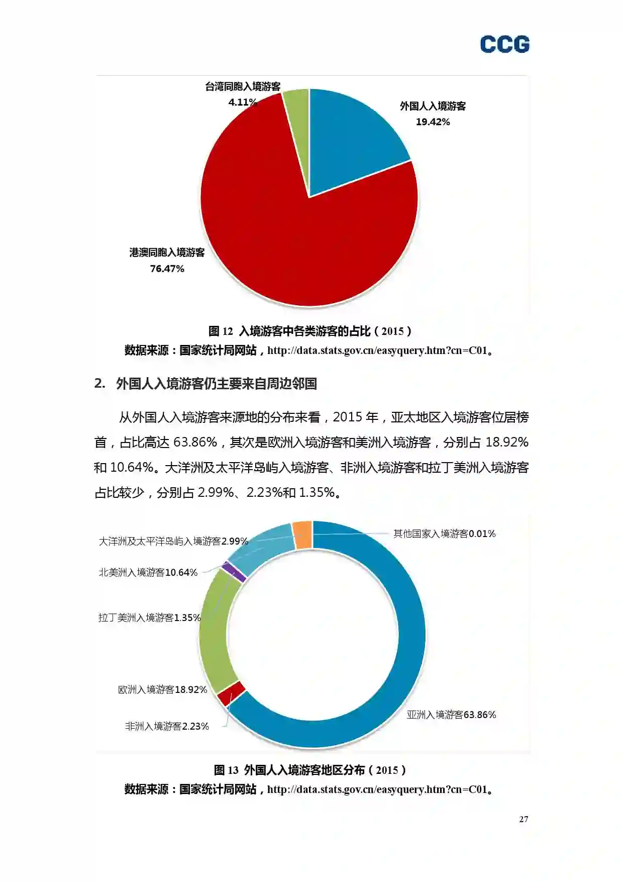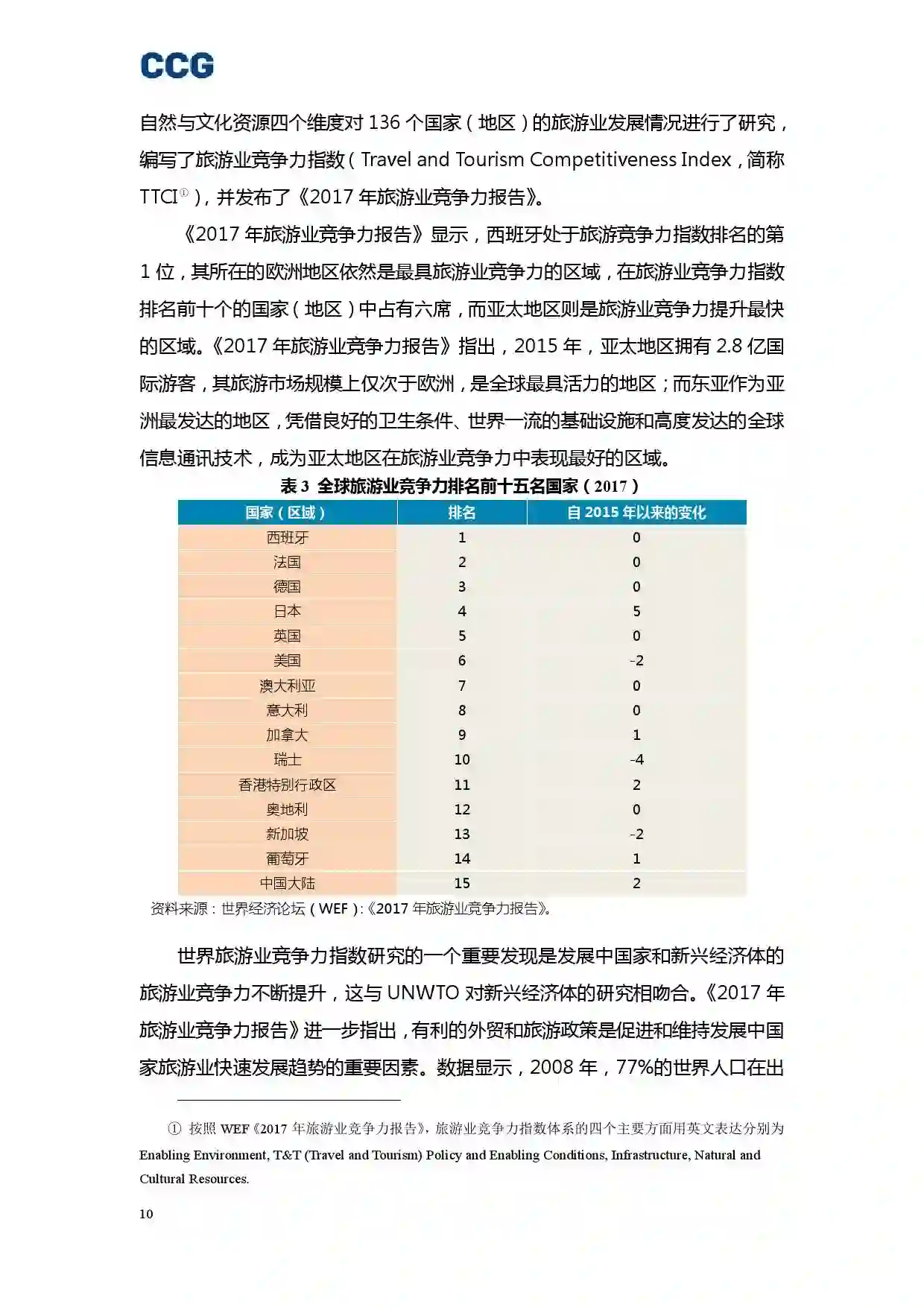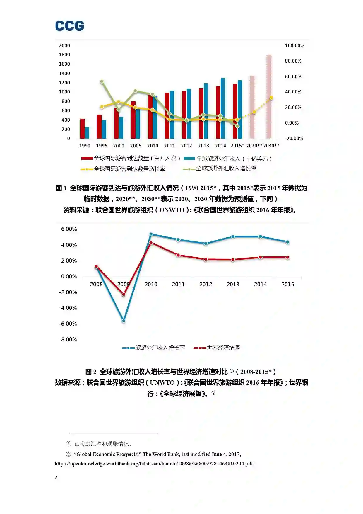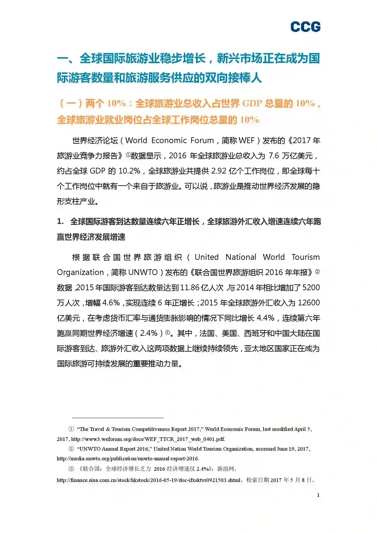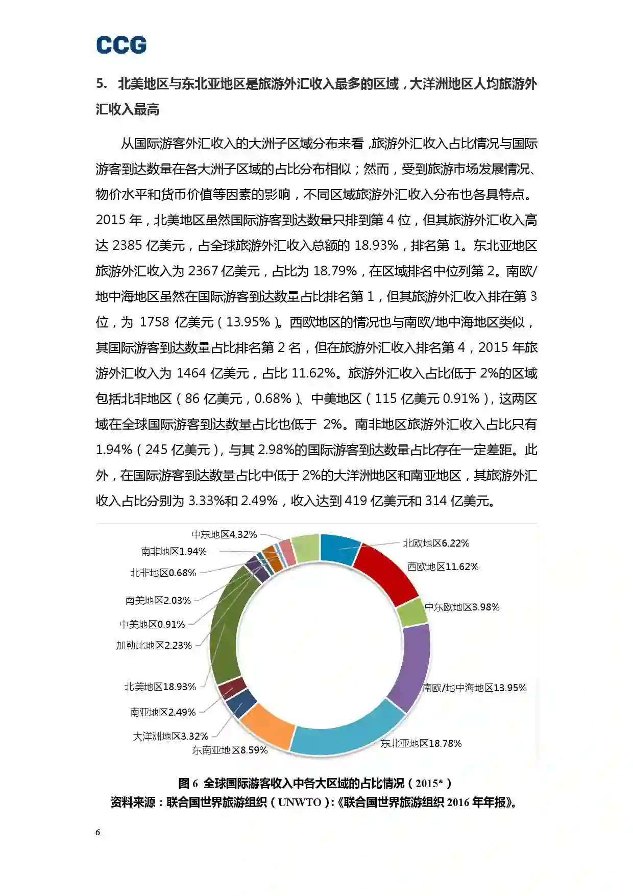根据全球化智库(CCG)与携程旅行网(Ctrip)联合发布的《从出入境旅游看中国全球化发展》系列报告一,2015年全球国际游客到达数量为11.86亿人次,全球旅游行业收入占全球GDP总额的10%,其中外汇收入为12600亿美元,在考虑货币汇率与通货膨胀影响的情况下同比增长4.4%,连续第六年跑赢当年世界经济增速(2.4%)。2016年,全球旅游业总收入为76000亿美元,共提供2.92亿个工作岗位,即全球每十个工作岗位中就有一个来自于旅游业。旅游业创造收入和提供就业岗位“两个10%”的全球占比可以表明,旅游业已成为推动世界经济发展的隐形支柱产业。