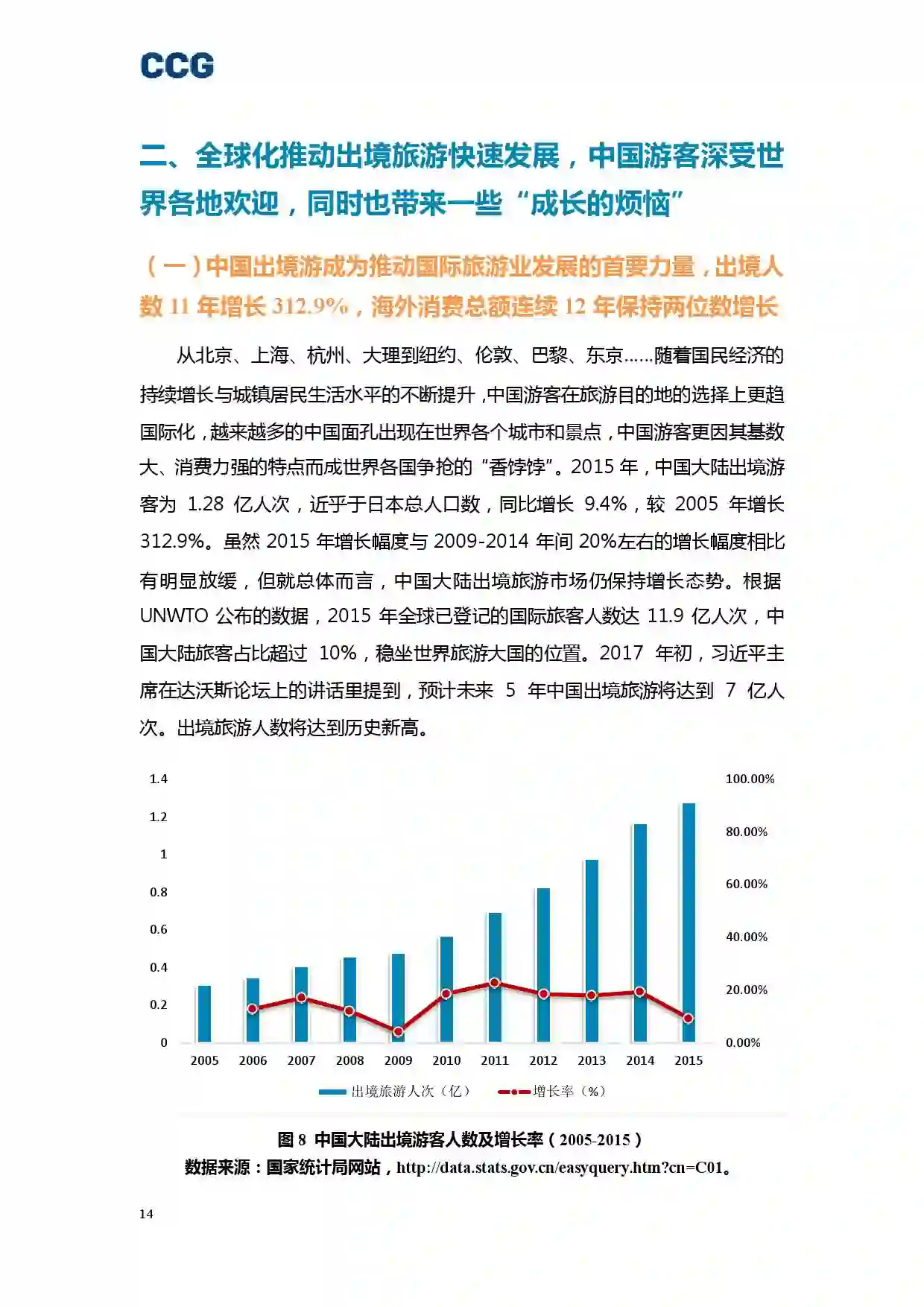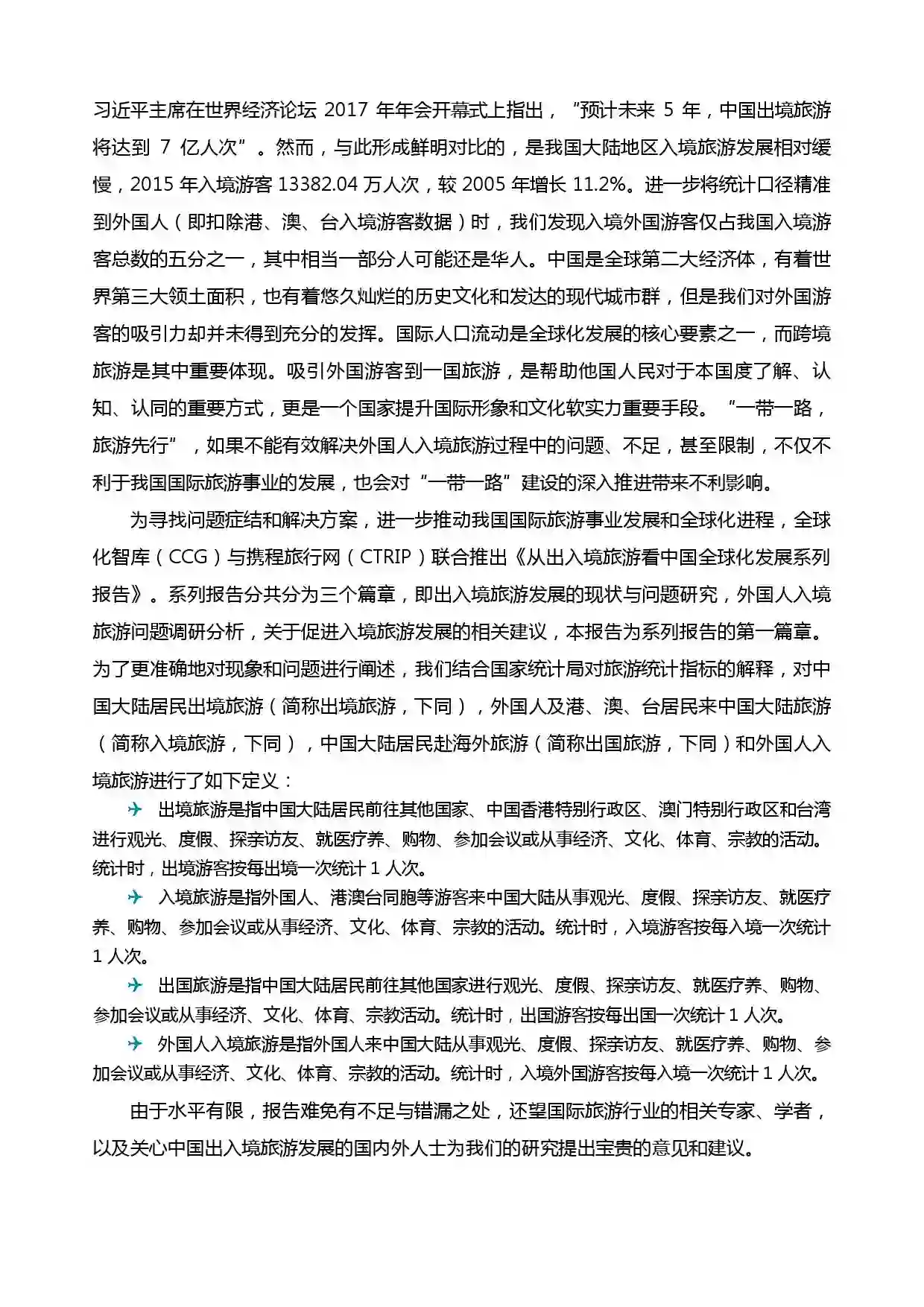 据悉,全球化智库(CCG)与携程旅行网(Ctrip)联合推出的《从出入境旅游看中国全球化发展》系列报告旨在寻找问题症结,探索解决方案,进一步推动中国国际旅游事业发展和全球化进程。系列报告分共分为三个篇章,即出入境旅游发展的现状与问题研究,外国人入境旅游问题调研分析,关于促进入境旅游发展的相关建议。本次发布的报告为系列报告的第一篇章,目的在于把握世界和中国旅游业发展的最新态势,尤其是其新变化,并对存在的问题进行透视与分析。携程旅游网为报告提供了相关的数据支持。
