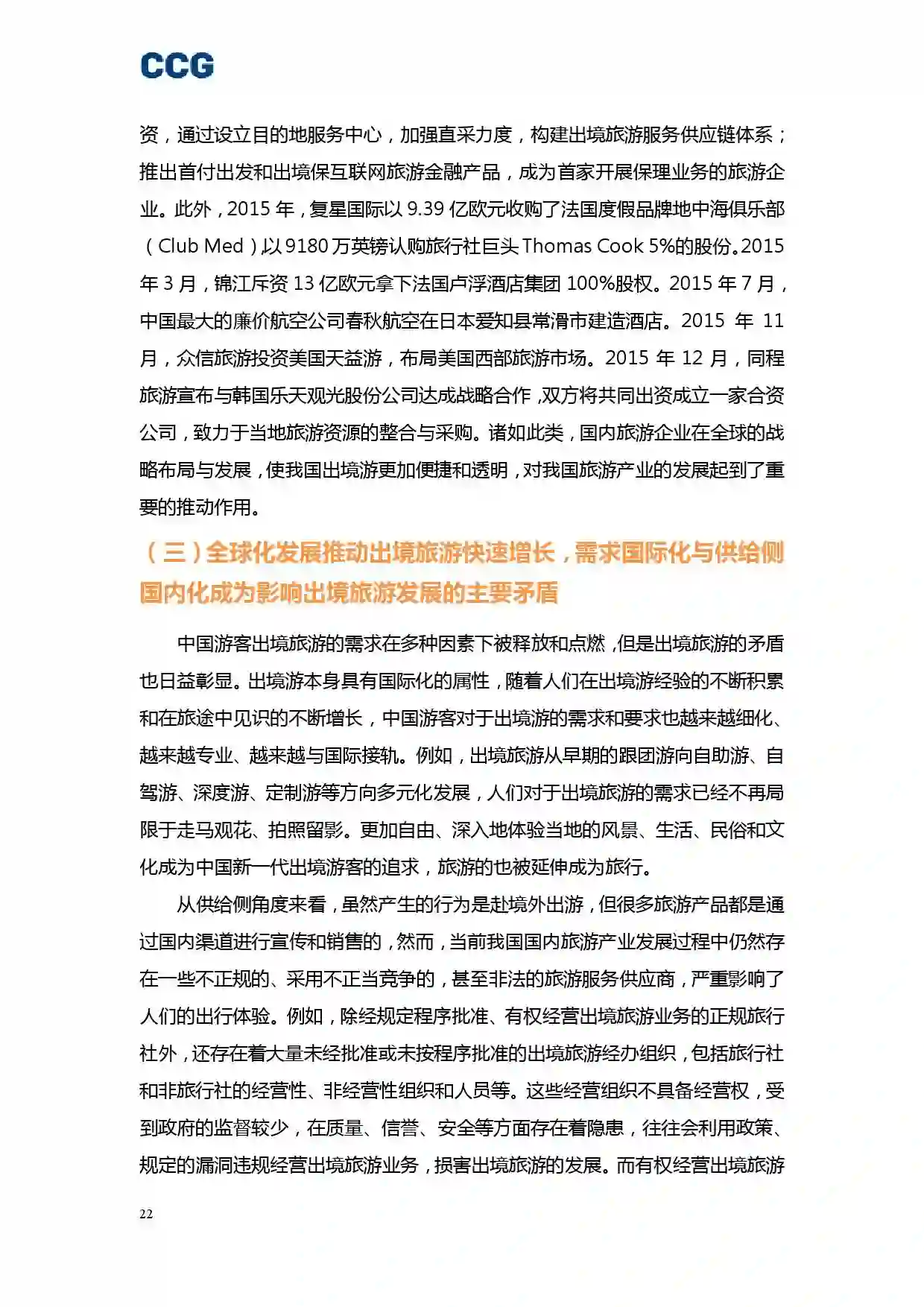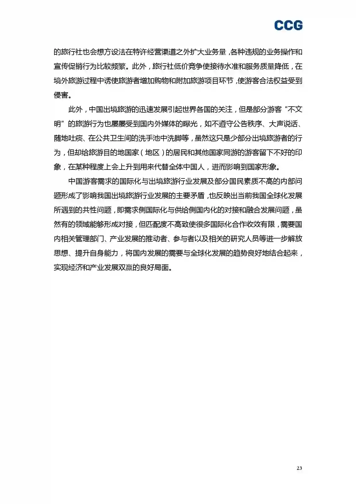 全球化智库(CCG)与携程旅行网(Ctrip)联合发布的《从出入境旅游看中国全球化发展》系列报告一分析指出,中国游客出境旅游的需求在多种因素下被释放和点燃,但是出境旅游的矛盾也日益彰显。从需求侧来看,出境游本身具有国际化属性。随着人们出境游经验的不断积累和在旅途见识的不断增长,中国游客对于出境游的需求和要求也越来越细化和专业、越来越与国际接轨。然而,从供给侧来看,虽然产生的行为是赴境外出游,但很多旅游产品都是通过国内渠道进行宣传和销售,且当前我国国内旅游产业发展中仍存在一些不正规的、采用不正当竞争的、甚至非法的旅游服务供应商,严重影响了游客的出行体验,甚至侵害了游客的合法权益。此外,部分中国出境游客“不文明”的旅游行为也屡受曝光,给旅游目的地居民和同游的游客留下不好的印象。