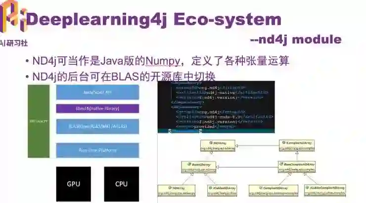 DL4j 本身,它定义并且实现了比较经典的神经网络结构,比如图片中比较常用的卷积神经网络。机器学习都需要依赖一个张量运算框架,对于 DL4j,他依赖的是 ND4j 这样一个框架,libnd4j 是 ND4j 调用的一个库。