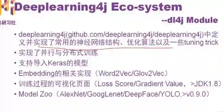 第二部分为 DL4j 的生态圈,主要介绍生态圈中最重要的三个模块:DL4j 本身,它所依赖的张量预算库 ND4j、DL4j 当中做数据 ETL 的库 DataVec。