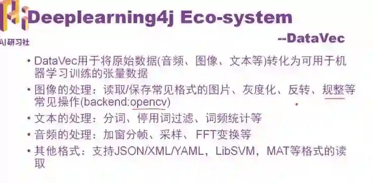 数据 ETL 库,称之为 DataVec, 它的主要功能就是把语音信号,图片文件,文本文档转化为张量形式,做数据 ETL.