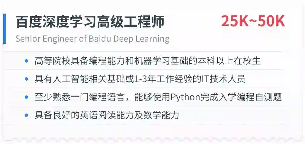 课程培养目标对标百度深度学习高级工程师,可以帮助你在6-8个月内达到能够合理组合、改造并创新模型来解决企业级应用问题的水平。