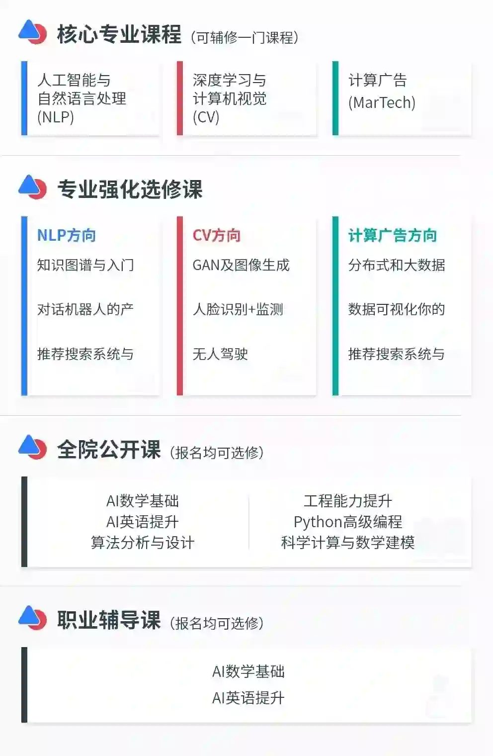 为满足不同基础学员需求,更有丰富的人工智能专业选修课及全院公开课帮助学员全面提升。