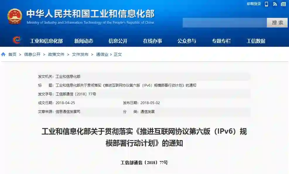 2017年11月,中共中央办公厅、国务院办公厅印发了《推进互联网协议第六版(IPv6)规模部署行动计划》,并发出通知,要求各地区各部门结合实际认真贯彻落实。