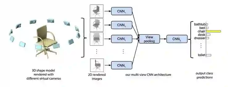 使用 3D 数据的多视图表示,是 2D 深度学习技术适配于 3D 的最简单方法。将 3D 感知问题转换为 2D 感知问题是一个聪明的做法,但在某种程度上,这种方法仍然需要你推理出一个目标的 3D 几何。早期基于深度学习的工作使用了这一方法的是 SU 等人的论文 Multi-view CNN(2015,https://arxiv.org/pdf/1505.00880.pdf),它提出的 Multi-view CNN 这个简单而有效的结构,能从一个 3D 目标的多个 2D 视图中学习特征描述符。比起使用单个 2D 图像来进行目标分类,采用了这一方法的结构具有更好的性能。它的实现方式是:将单个图像喂给在 ImageNet 上进行了预训练的 VGG 网络从而来提取显著特征、池化产生的激活图,并将这些信息传送到附加卷积层来进一步进行特征学习。
