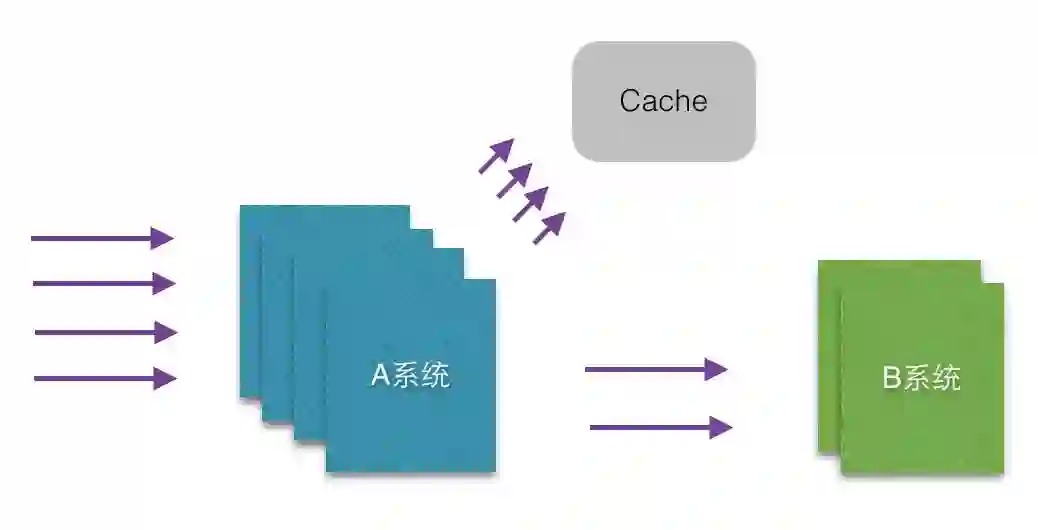 Cache系统故障,A系统的流量将全部流到B系统,造成B系统过载。