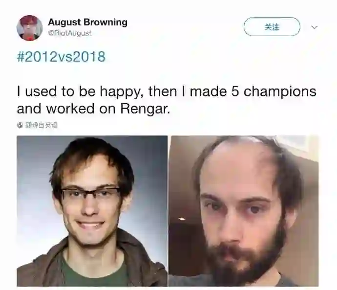 《英雄联盟》的英雄设计师August Browning最近在推特上晒出了六年前的自己和现在的自己的对比图,August Browning表示过去的他原本很快乐,但直至他设计了5个英雄并参与设计雷恩加尔之后就……【via twi RiotAugust】