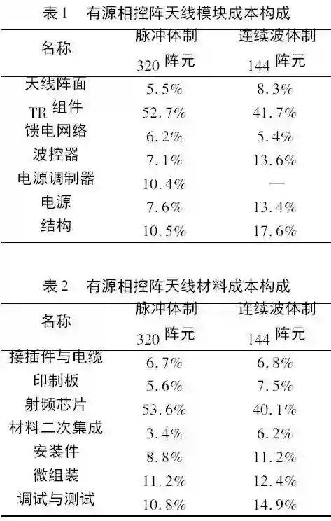 天线阵面主要包括辐射单元、金属基板、射频接插件等。TR 组件包括TR 腔体、PCB 板或LTCC 板、软基片、功率放大器、低噪声放大器、移相器、串并转换、滤波器,温度补偿、射频接插件、以及低频接插件等,对有源相控阵天线来说,TR 组件占成本的主要部分。馈电网络包括收发共用馈线、发射功率分配网络,以及接收信号合成网络; 通常情况下,为了确保接收支路的增益和使发射支路的末级放大器推饱和,需要在接收支路中增加驱动级低噪声放大器和在发射支路中增加驱动级功率放大器,对于有单脉冲测角要求的,馈电网络还需设计成和波束、方位差和俯仰差波束接收通道,这些都会导致有源相控阵天线成本增加。波控器核心器件是FPGA,其主要功能是将终端控制命令计算成控制TR 组件内移相器的TTL /LVTTL 电平,并生成移相码,从而改变天线阵面信号相位因子,完成有源相控阵天线的波束快速扫描,此外波控器还可以具有电源分发的功能,从而实现给TR 组件内的芯片供电,并具备校准测试的配合执行功能( 适应TR 组件自动测试和天线内/外校准功能) 。电源主要实现的功能是将直流电压转换成各个器件需要的电源值,即DC /DC 转换,对于脉冲工作体制的天线,电源还需包含信号调制器,从而实现连续波信号转换成脉冲信号。