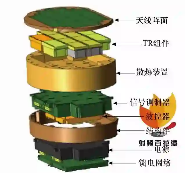 所谓有源相控阵天线,就是在每个天线单元通道中设置固态发射/接收组件[13],其典型的特征就是在每个天线单元发射通道中集成了功率放大器和在每个天线单元接收通道中集成了低噪声放大器。典型的有源相控阵天线主要包括天线阵面、TR 组件、馈电网络、波控器、电源( 含信号调制器) 、以及结构件( 含散热装置) 等,如图1 所示。