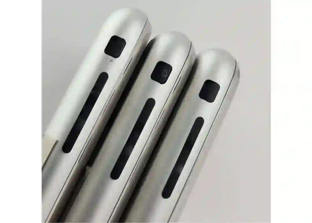 三部设备上的静音开关的特写镜头显示了设备之间的微小变化,除了开关的位置略有变化外,有一部原型机还显示了按钮表面上刻有的一个小铃铛,以提示用户按钮的功能。