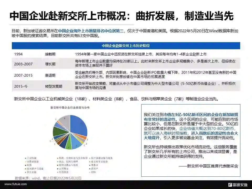 中国企业对新交所并不陌生。目前,中国企业境外上市数量上,新交所排名第三,仅次于中国香港和美国。根据2022年5月20日在Wind数据库新加坡中国股的搜索结果,目前新交所共有63支中国股。