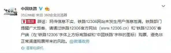 36氪讯,“中国铁路”官方微博发布辟谣消息,回应疑似12306售票网站用户信息泄露情况:“网传信息不实,铁路12306网站未发生用户信息泄露。"