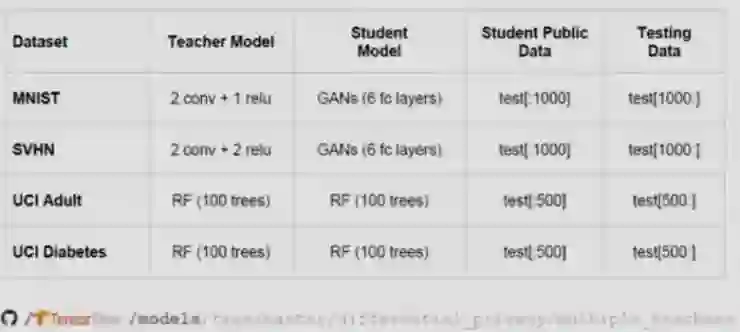 我们使用了四个数据库:MNIST、SVHN、UCI Adult 和 UCI Diabetes。在训练「教师模型」时,对于 MNIST 和 SVHN 两个图像数据库,我们使用了卷积架构;对于两个 UCI 数据库,我们使用了随机森林。在训练「学生模型」时,对于 MNIST 和 SVHN,我们使用了 PATE-G;对于两个 UCI 数据库,我们使用的是普通的 PATE 架构。顺便说一句,我们所有的实验设置都已经在 TensorFlow 模块上。