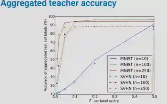 紫色这条线代表了一个包含 10 个「教师模型」的「聚合教师模型」(n=10)。当我们逐渐降低ε的值,意味着我们引入更多的随机噪声,加强隐私保障,那么这个「聚合教师模型」的准确率也很快下降。但是,图中绿线和红线的部分,分别是包含 100 个和 250 个「教师模型」的「聚合教师模型」(n=100,n=250),那么在较低ε值时,我们仍然可以保持较高的准确率。