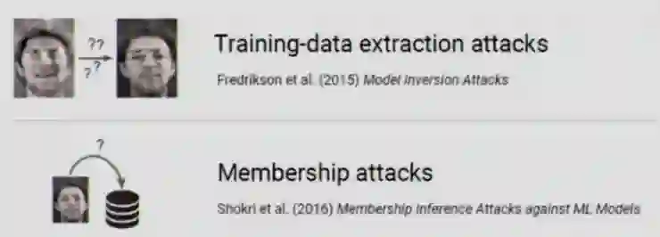 一些机器学习应用的训练涉及到敏感数据。这里是一个训练一般人脸识别模型的例子,2015 年一群研究员发现,通过机器学习模型的预测结果,可以反过来重建模型训练时使用的人脸数据。2016 年,另一拨研究人员发现,同样可以根据模型的预测结果,来推理出模型训练数据中是否包含了某个具体的训练点(training point),他们将这种攻击称之为「会员推理攻击」(membership inference attacks)。