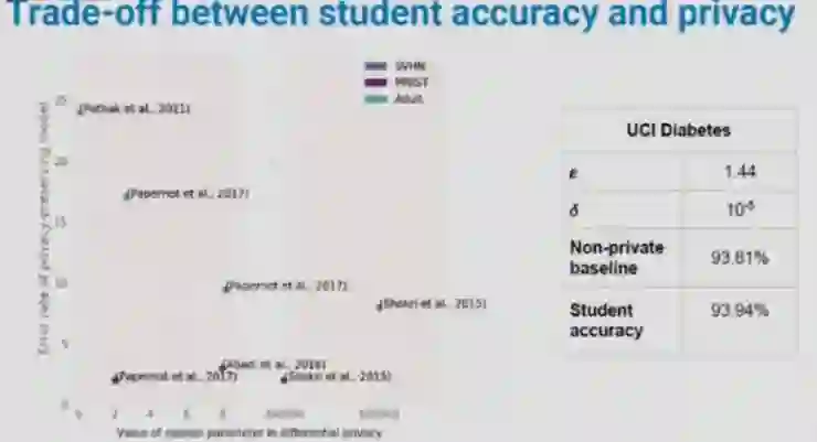 最后,对于 UCI Diabetes 数据库,我们发现了一些非常有趣的东西。隐私保护模型(student accuracy)比未加隐私保护的模型(non-private baseline)的准确率还要高。