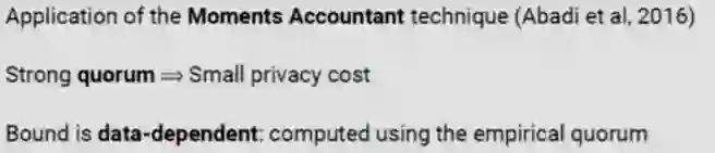 我们应用了 Moments Accountant 技巧,来自去年的一篇论文(Abadi et al,2016),可以对「教师模型」设置一个强固定数(strong quorum),从而带来小隐私成本。另外,差分隐私范围(bound)是依赖于数据的。