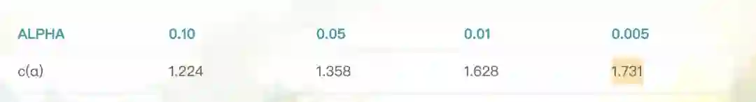 原始假设 H0:两组 sample 来自统一分布,在大样本上,在置信水平 α 下如果满足下面的条件则拒绝零假设(认为两组样本来自不同分布):