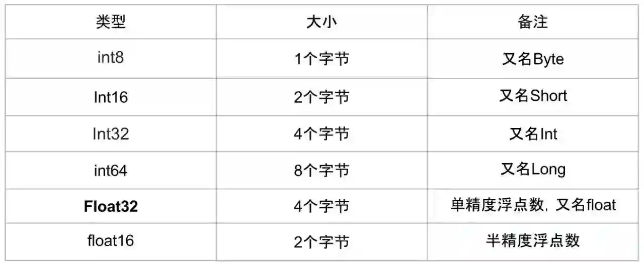 在深度学习中会用到各种各样的数值类型,数值类型命名规范一般为TypeNum,比如 Int64、Float32、Double64。