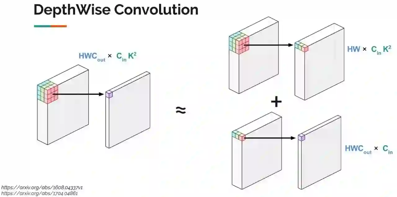 今年谷歌提出的 MobileNet,利用了一种被称为 DepthWise Convolution 的技术,将神经网络运行速度提升许多,它的核心思想就是把一个卷积操作拆分成两个相对简单的操作的组合。如图所示, 左边是原始卷积操作,右边是两个特殊而又简单的卷积操作的组合(上面类似于池化的操作,但是有权重,下面类似于全连接操作)。