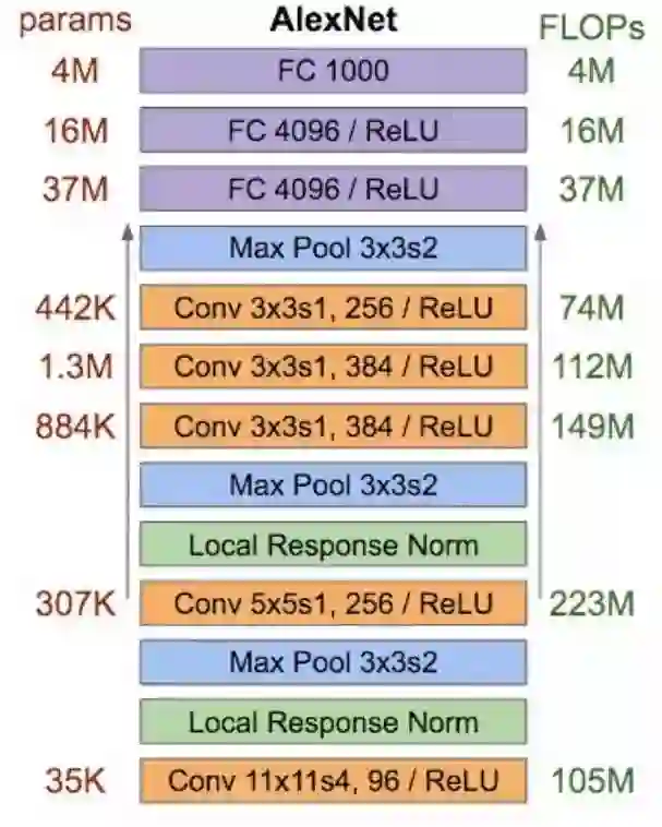 AlexNet 的分析如下图,左边是每一层的参数数目(不是显存占用),右边是消耗的计算资源
