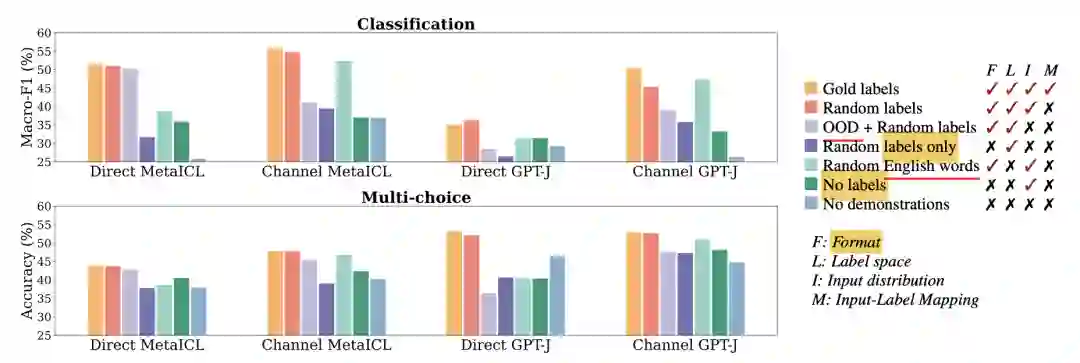 通过给in-context的训练样本赋予随机标签,可以构建随机标注的设置。从下图中可以看出,无论是分类任务(上),还是多项选择任务(下),随机标注设置下(红)模型表现均和正确标注(黄)表现相当,且明显超过没有in-context样本的zero-shot 设置(蓝)。