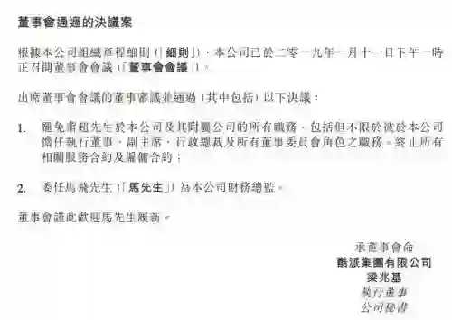 【TechWeb】1月14日消息,酷派日前发布公告称,公司已于2019年1月11日召开董事会会议,出席董事会会议的董事审议并通过(其中包括)以下决议:罢免蒋超于公司及其附属公司的所有职务,包括但不限于彼于公司担任执行董事、副主席、行政总裁及所有董事委员会角色职务。终止所有相关服务合约及雇佣合约。