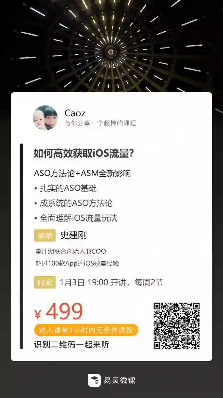 史建刚,量江湖联合创始人,移动互联网流量圈老鸟,我上次去北京特意主动求见了两个高手,其中一个前段时间提过,是粥左罗,另一个就是这个史建刚,在我的极力邀请下,他才同意开设这门ASM+ASO课程。我今天自吹一句,这几年能进入我主动联系主动约见名单的,有一个算一个,各个都是各自领域内相当厉害的低调高手。