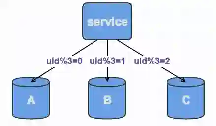 比如目前规划了3个数据库,基于uid进行取余分片,那么每个库上的划分规则如下: